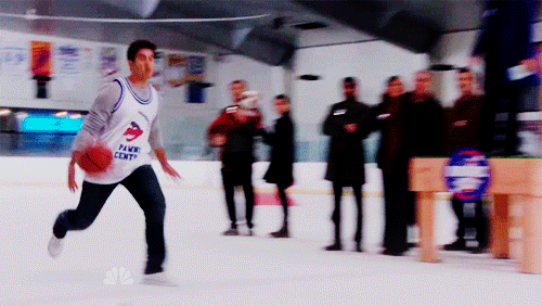 But no, tonight we stay in our seats (sorry, Mom and Dad!) and we chat and at some point, my sister and I start quoting Parks & Rec and I make mention of the episode in which Pistol Pete Disellio tries to dunk a basketball…only problem is he’s on a hockey rink instead of a basketball court and things don’t go so well.